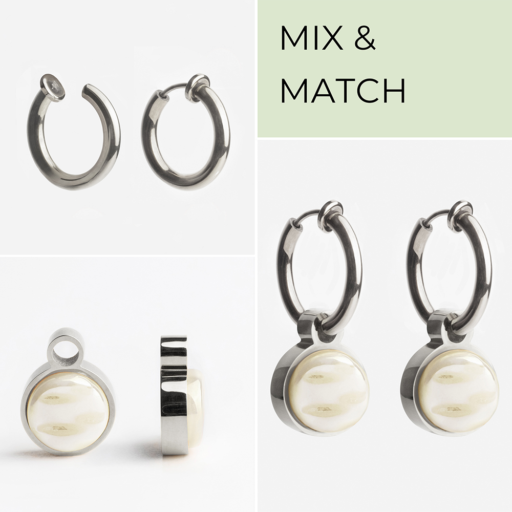 Die praktischen Mix & Match Clip Creolen mit Anhängern gibt es in zwei Größen (14 und 18mm). Sie können ganz dezent sein oder zu einem Eyecatcher an Deinem Ohr werden.