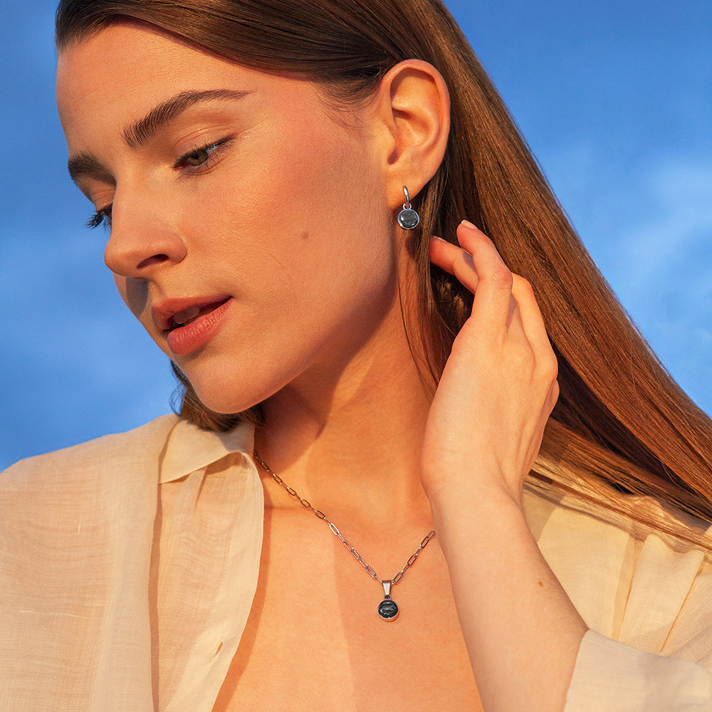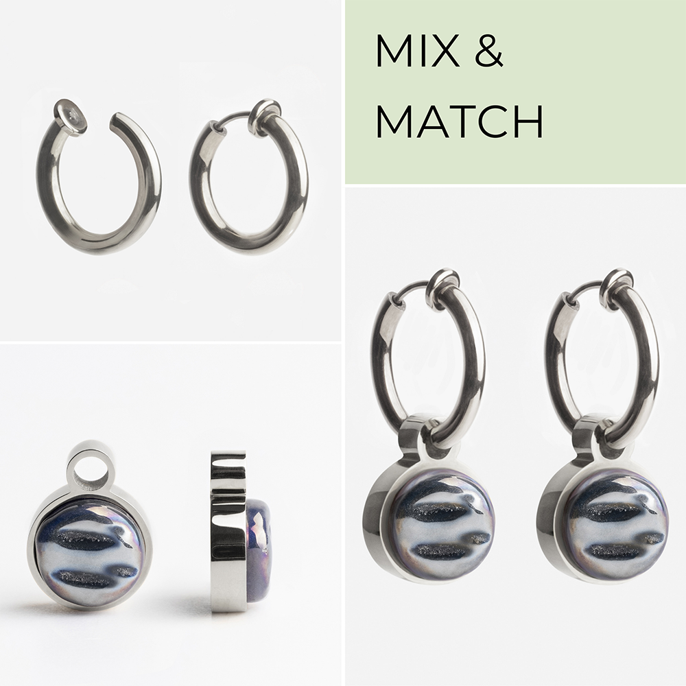 Die Clip Creolen aus hochwertigem Edelstahl sind in drei Metallfarben und 20 Steinfarben erhältlich. Die abnehmbaren Anhänger gleiten geschmeidig über die Clips und verleihen jedem Look eine individuelle Note. Der weiche Federverschluss sorgt für einen bequemen Sitz.