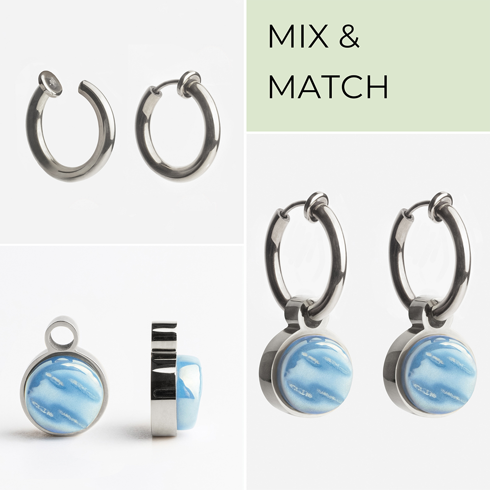 Clip Creolen aus Edelstahl mit austauschbaren Anhängern in 20 Farben. Ohrclips mit Federverschluss, ideal für stilvolle Looks, auch ohne Ohrlöcher.