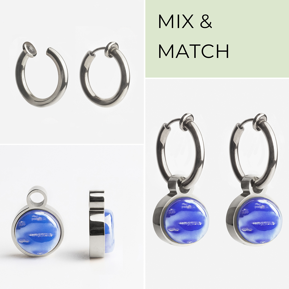 Clip Creolen aus Edelstahl mit austauschbaren Anhängern in 20 Farben. Ohrclips mit Federverschluss, ideal für stilvolle Looks, auch ohne Ohrlöcher.