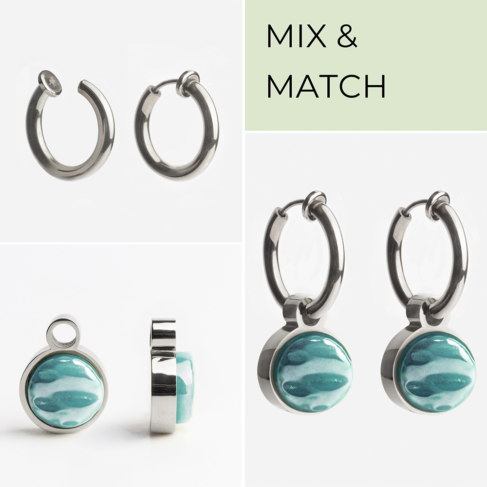 Die Clip Creolen aus hochwertigem Edelstahl sind in drei Metallfarben und 20 Steinfarben erhältlich. Die abnehmbaren Anhänger gleiten geschmeidig über die Clips und verleihen jedem Look eine individuelle Note. Der weiche Federverschluss sorgt für einen bequemen Sitz.