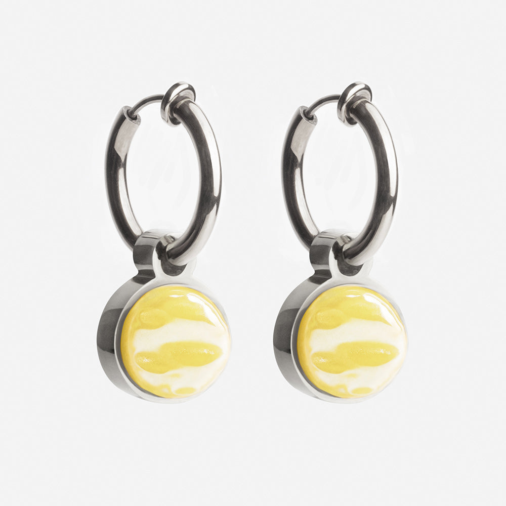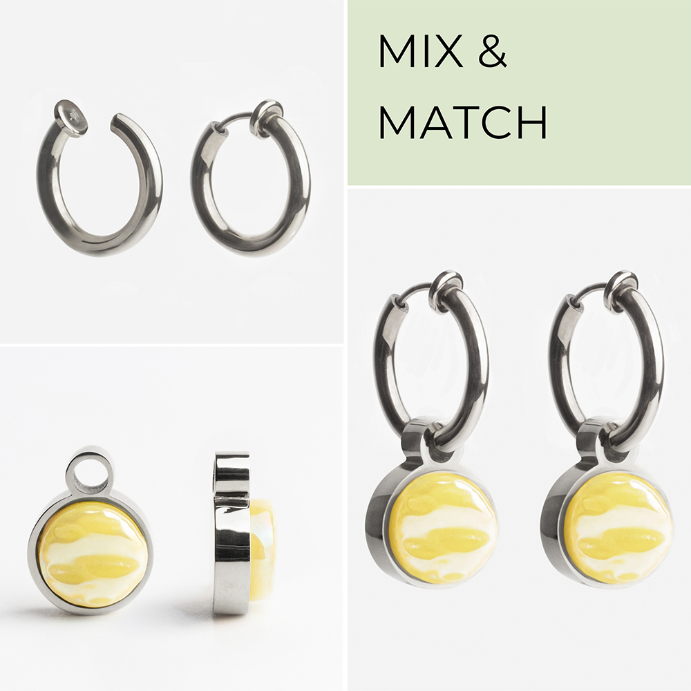 Die Clip Creolen aus hochwertigem Edelstahl sind in drei Metallfarben und 20 Steinfarben erhältlich. Die abnehmbaren Anhänger gleiten geschmeidig über die Clips und verleihen jedem Look eine individuelle Note. Der weiche Federverschluss sorgt für einen bequemen Sitz.