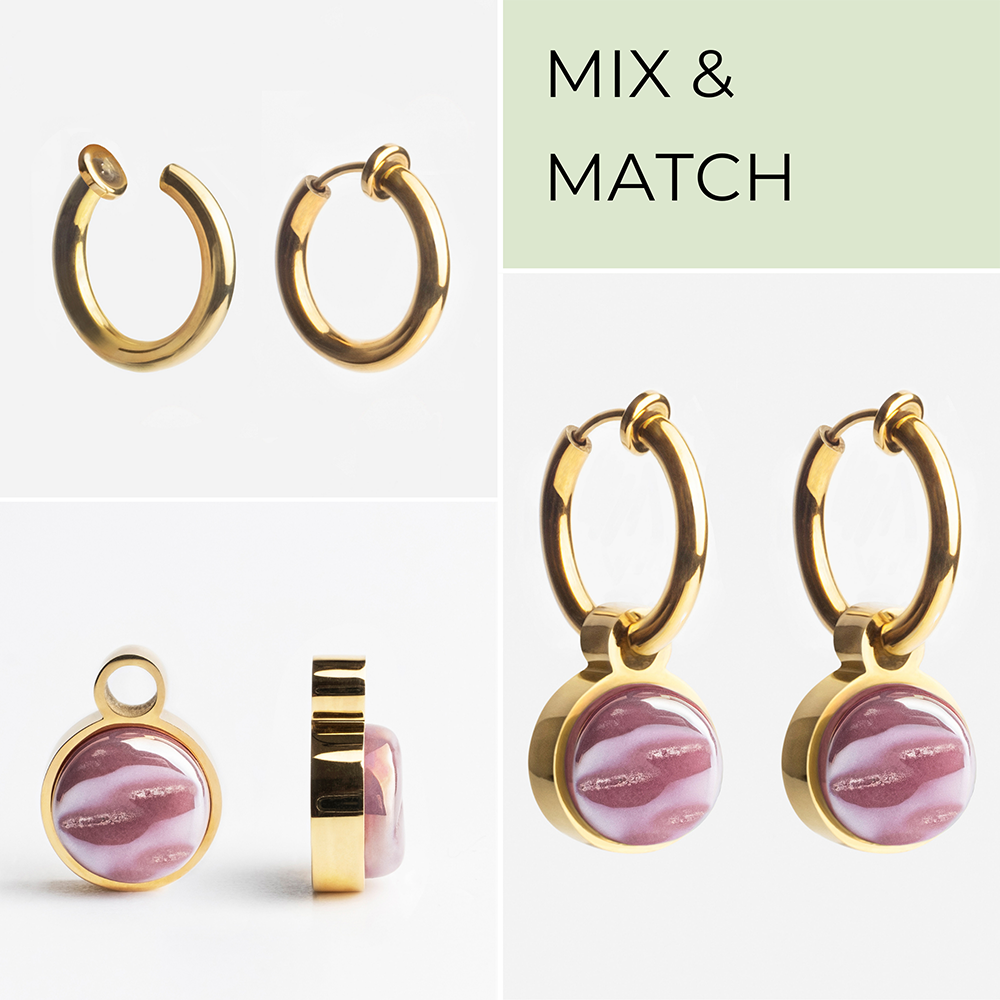 Die praktischen Mix & Match Clip Creolen mit Anhängern gibt es in zwei Größen (14 und 18mm). Sie können ganz dezent sein oder zu einem Eyecatcher an Deinem Ohr werden.