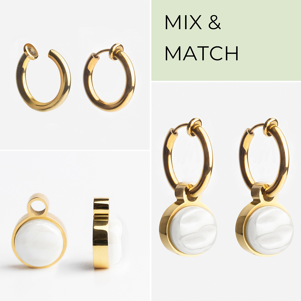 Die praktischen Mix & Match Clip Creolen mit Anhängern gibt es in zwei Größen (14 und 18mm). Sie können ganz dezent sein oder zu einem Eyecatcher an Deinem Ohr werden.