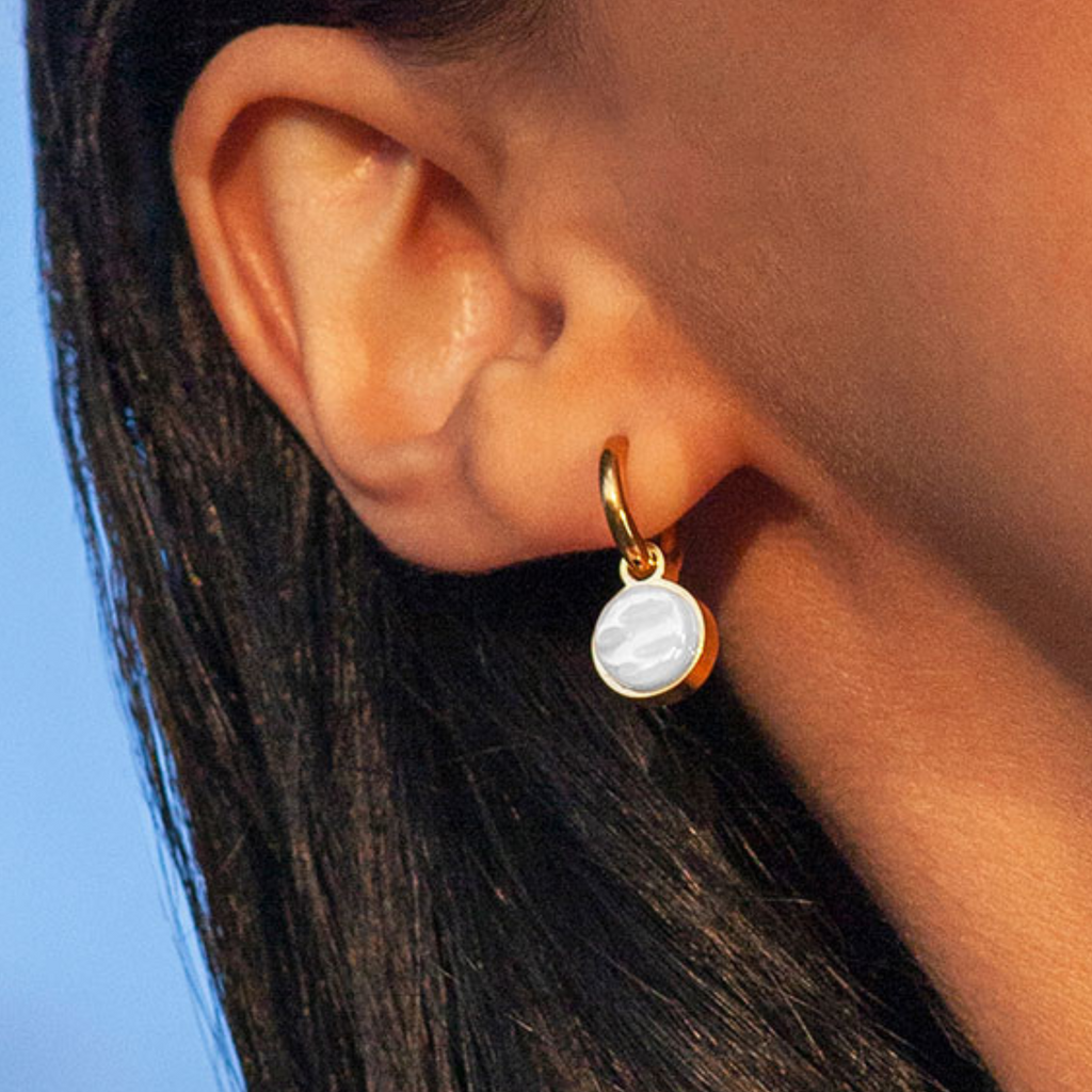 Die Anhänger bestehen aus recyceltem Glas mit einer strahlenden Perlmuttbeschichtung, die den Charme von Halbedelsteinen versprüht, ohne dabei endliche Ressourcen zu verbrauchen. Die Ohrclips sind wasserabweisend und langlebig und werden auf nachhaltige Weise in Europa hergestellt. Ob mit oder ohne Ohrlöcher, mit den Clip Creolen setzt Du ein Statement für Stil und Nachhaltigkeit!
