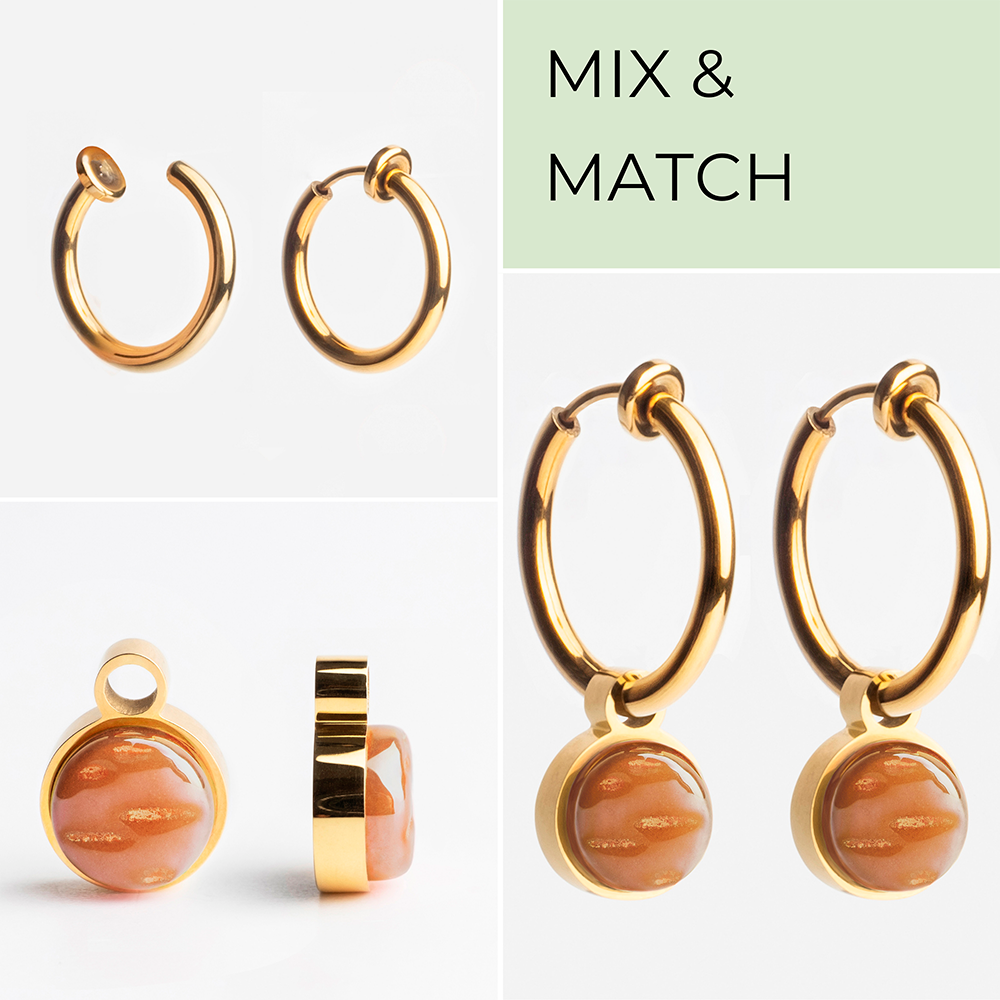 Die praktischen Mix & Match Clip Creolen mit Anhängern gibt es in zwei Größen (14 und 18mm). Sie können ganz dezent sein oder zu einem Eyecatcher an Deinem Ohr werden.