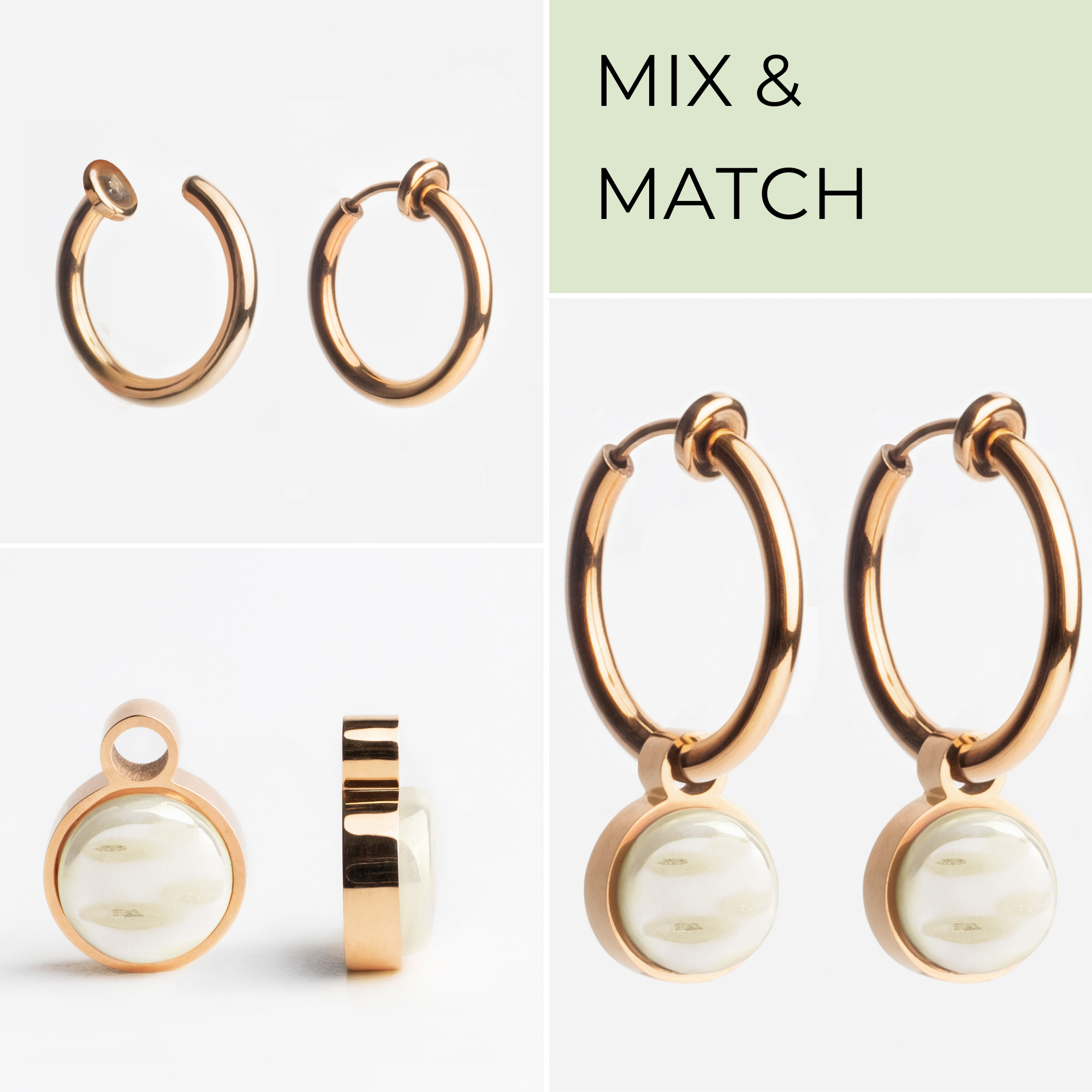 Die praktischen Mix & Match Clip Creolen mit Anhängern gibt es in zwei Größen (14 und 18mm). Sie können ganz dezent sein oder zu einem Eyecatcher an Deinem Ohr werden.