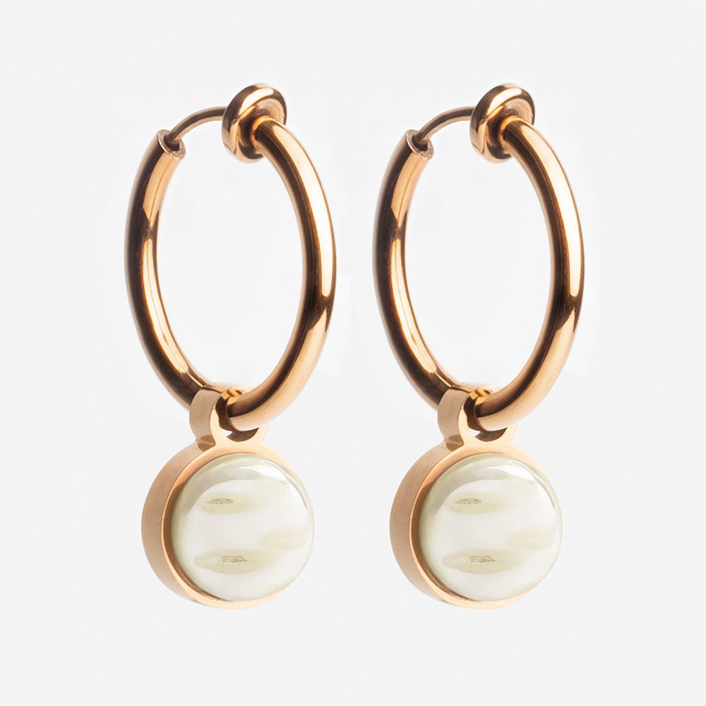 Die Clip Creolen aus hochwertigem Edelstahl sind in drei Metallfarben und 20 Steinfarben erhältlich. Die abnehmbaren Anhänger gleiten geschmeidig über die Clips und verleihen jedem Look eine individuelle Note. Der weiche Federverschluss sorgt für einen bequemen Sitz.