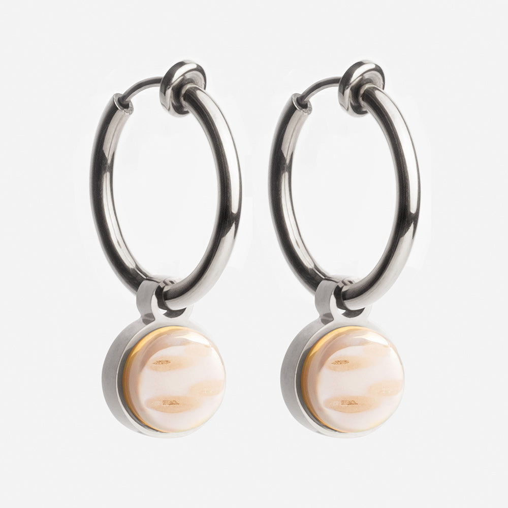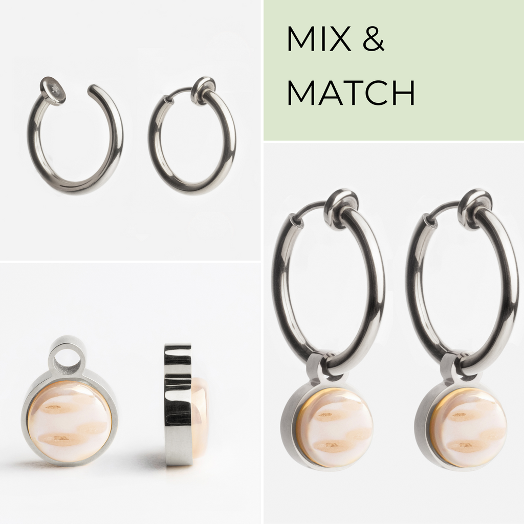 Ohrclip Creolen aus Edelstahl mit Charms zum Wechseln in 20 Farben. Perfekt für stilvolle Akzente am Ohr, auch ohne Ohrlöcher. Nachhaltig und bequem.