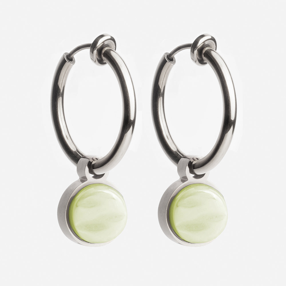 Die Clip Creolen aus hochwertigem Edelstahl sind in drei Metallfarben und 20 Steinfarben erhältlich. Die abnehmbaren Anhänger gleiten geschmeidig über die Clips und verleihen jedem Look eine individuelle Note. Der weiche Federverschluss sorgt für einen bequemen Sitz.