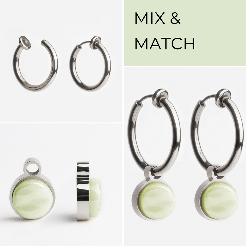 Ohrclip Creolen aus Edelstahl mit Charms zum Wechseln in 20 Farben. Perfekt für stilvolle Akzente am Ohr, auch ohne Ohrlöcher. Nachhaltig und bequem.