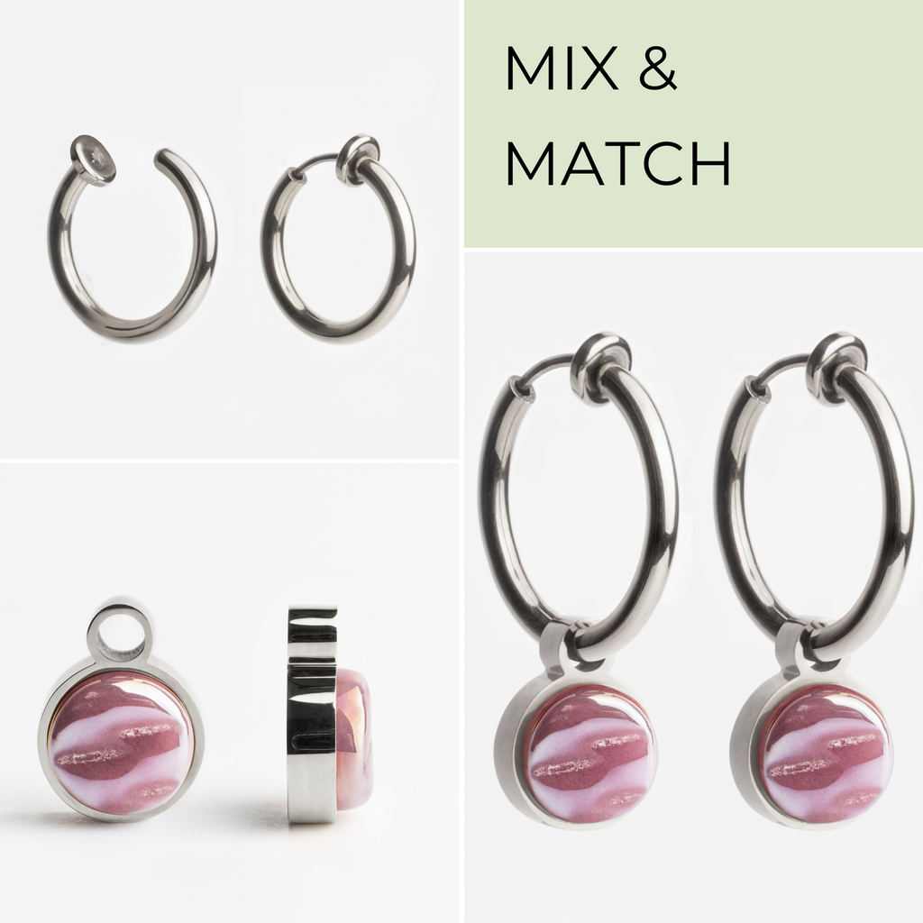 Ohrclip Creolen aus Edelstahl mit Charms zum Wechseln in 20 Farben. Perfekt für stilvolle Akzente am Ohr, auch ohne Ohrlöcher. Nachhaltig und bequem.