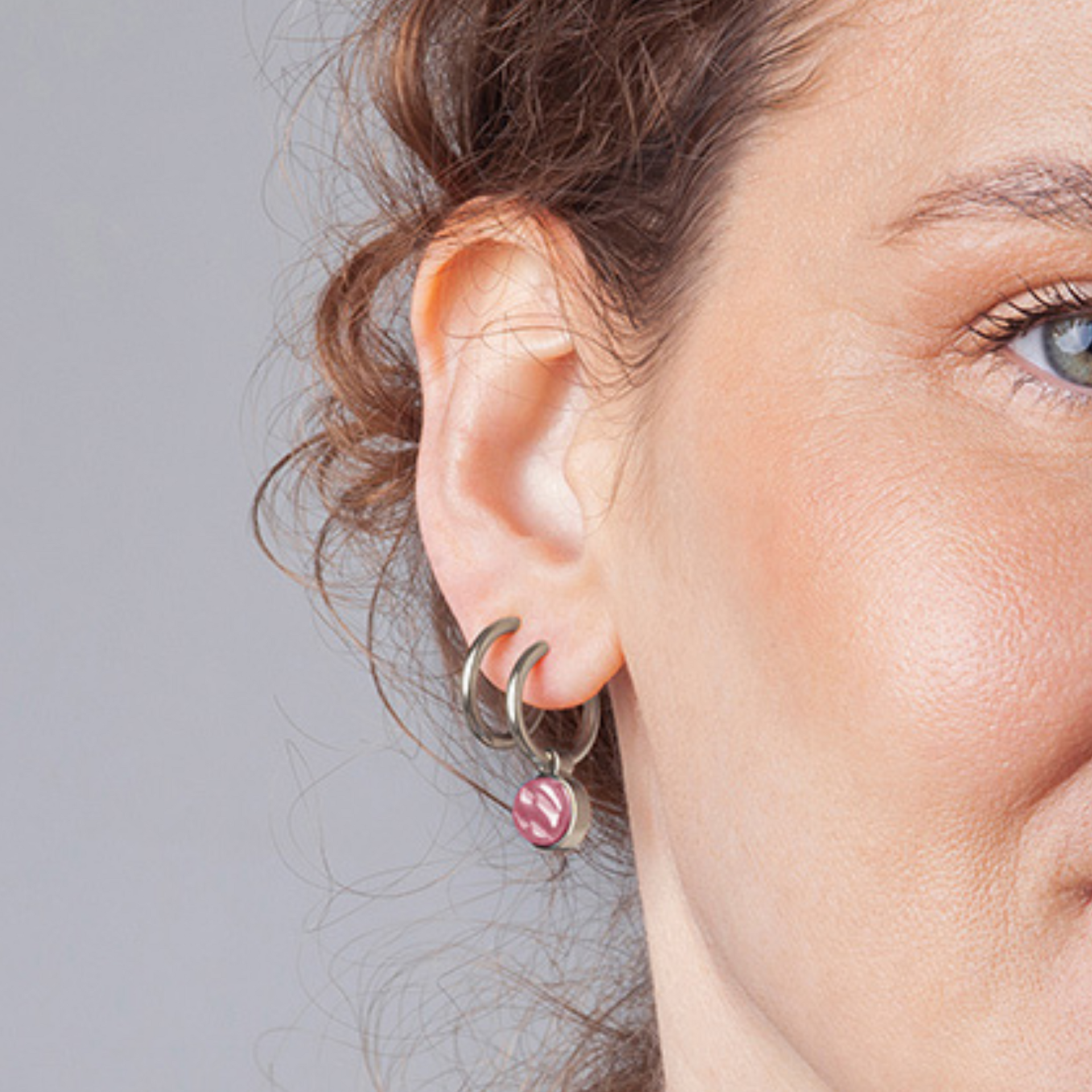 Die Clip Creolen aus hochwertigem Edelstahl sind in drei Metallfarben und 20 Steinfarben erhältlich. Die abnehmbaren Anhänger gleiten geschmeidig über die Clips und verleihen jedem Look eine individuelle Note. Der weiche Federverschluss sorgt für einen bequemen Sitz.