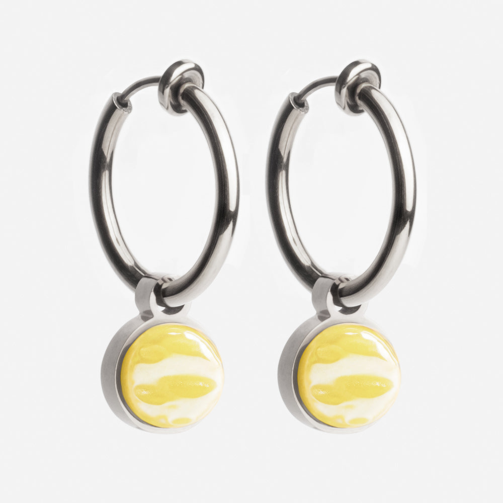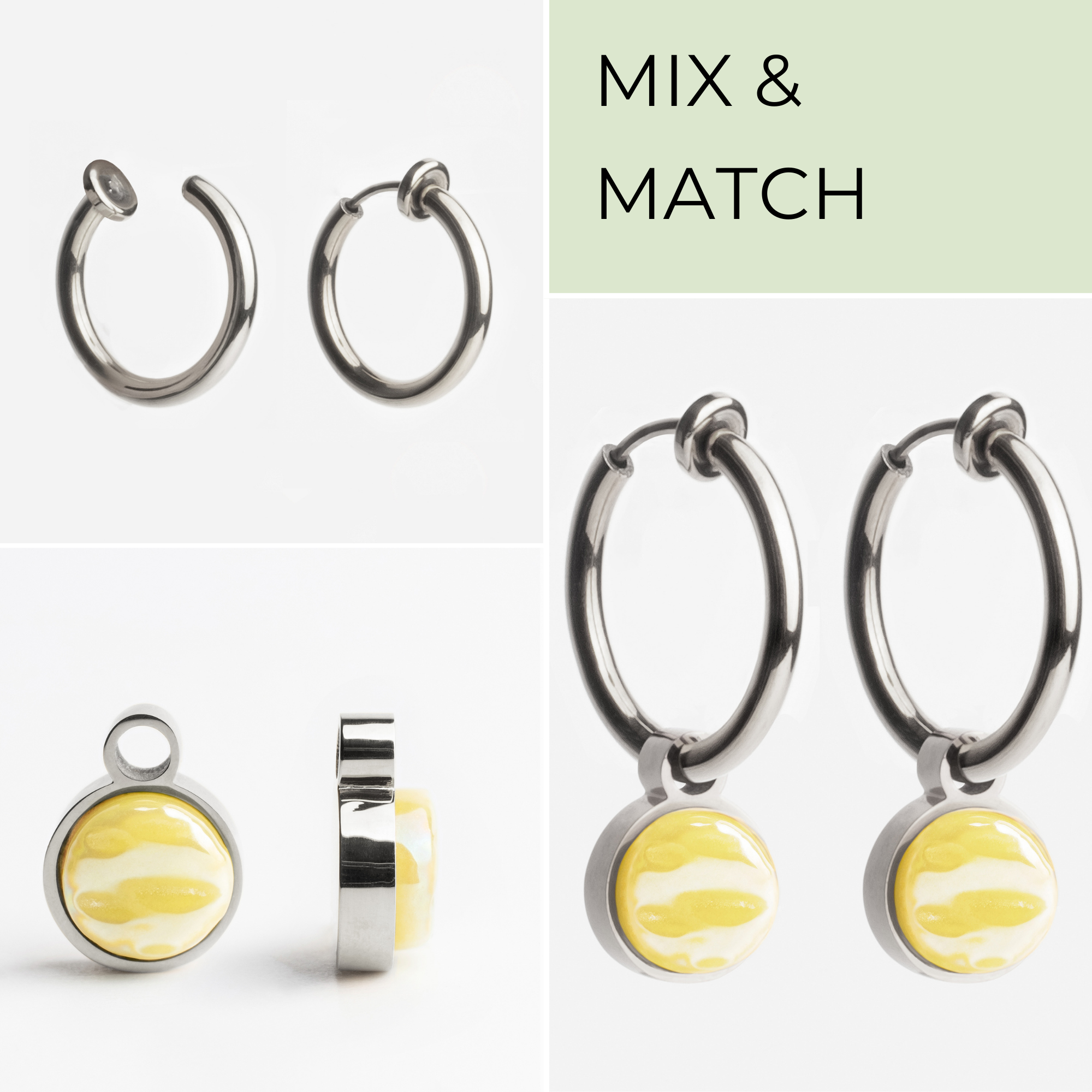 Ohrclip Creolen aus Edelstahl mit Charms zum Wechseln in 20 Farben. Perfekt für stilvolle Akzente am Ohr, auch ohne Ohrlöcher. Nachhaltig und bequem.