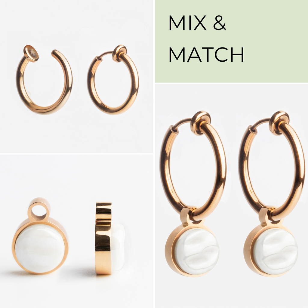 Die praktischen Mix & Match Clip Creolen mit Anhängern gibt es in zwei Größen (14 und 18mm). Sie können ganz dezent sein oder zu einem Eyecatcher an Deinem Ohr werden.