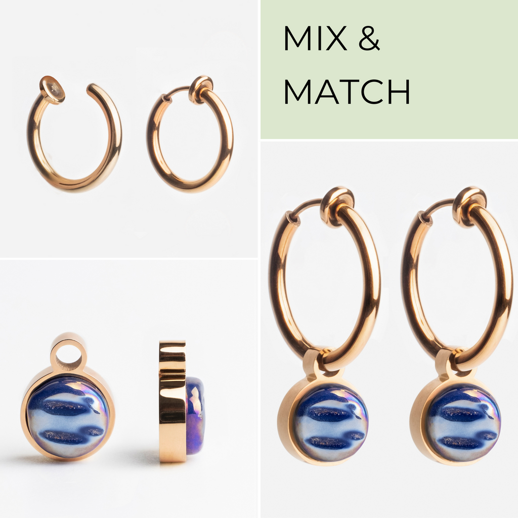 Ohrclip Creolen aus Edelstahl mit Charms zum Wechseln in 20 Farben. Perfekt für stilvolle Akzente am Ohr, auch ohne Ohrlöcher. Nachhaltig und bequem.