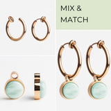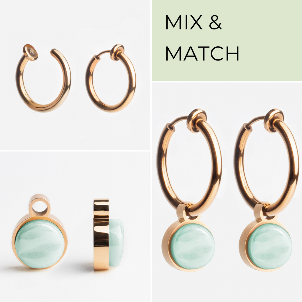 Die Clip Creolen aus hochwertigem Edelstahl sind in drei Metallfarben und 20 Steinfarben erhältlich. Die abnehmbaren Anhänger gleiten geschmeidig über die Clips und verleihen jedem Look eine individuelle Note. Der weiche Federverschluss sorgt für einen bequemen Sitz.