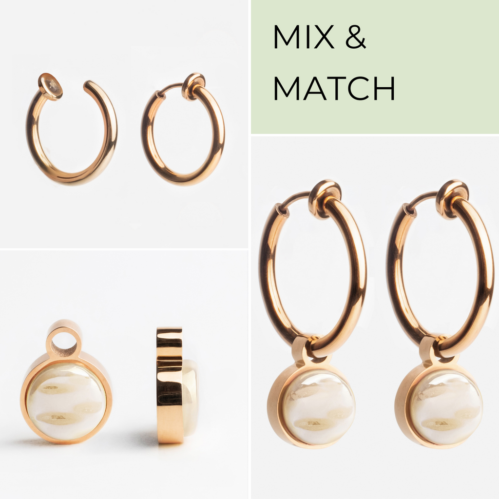 Die praktischen Mix & Match Clip Creolen mit Anhängern gibt es in zwei Größen (14 und 18mm). Sie können ganz dezent sein oder zu einem Eyecatcher an Deinem Ohr werden.