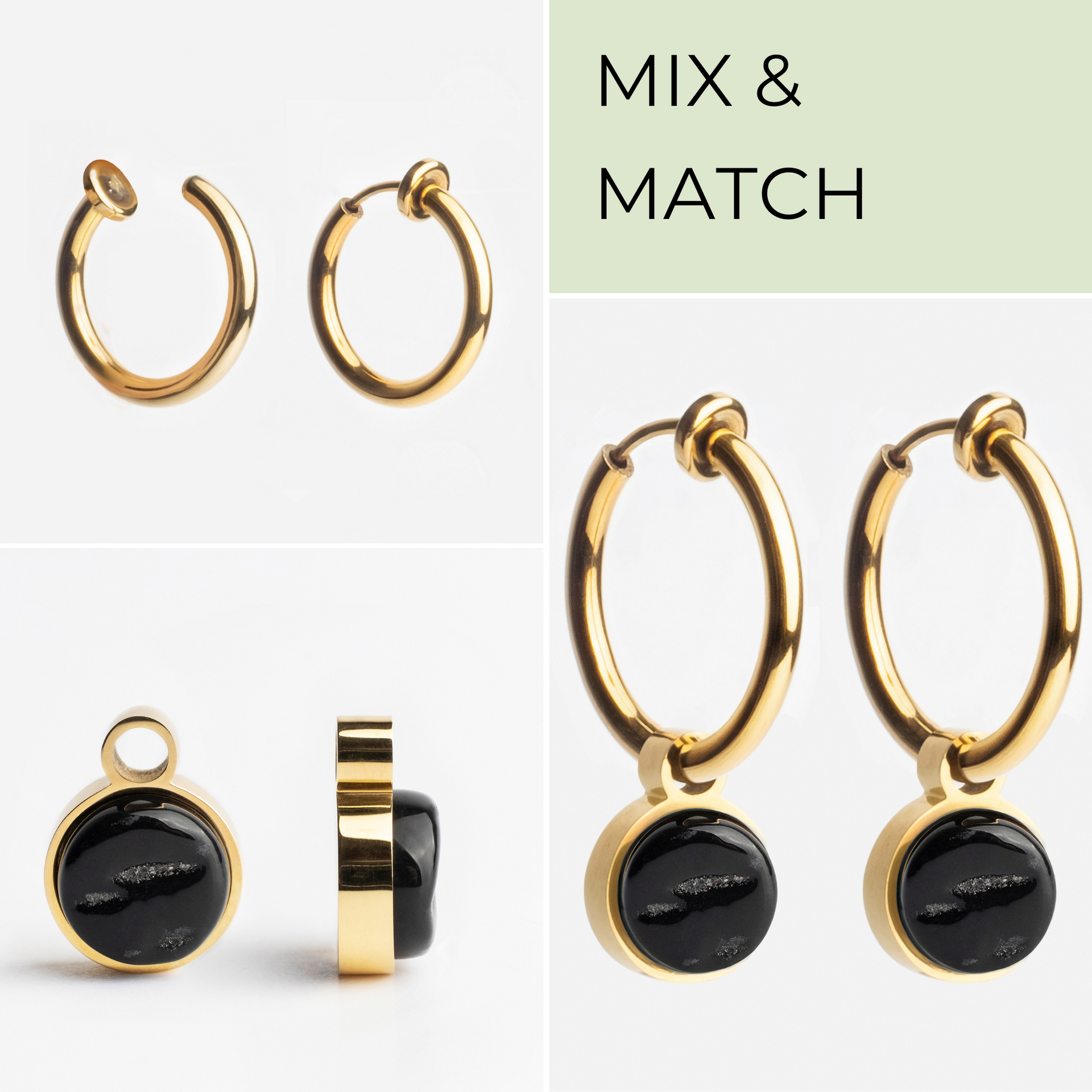 Die praktischen Mix & Match Clip Creolen mit Anhängern gibt es in zwei Größen (14 und 18mm). Sie können ganz dezent sein oder zu einem Eyecatcher an Deinem Ohr werden.