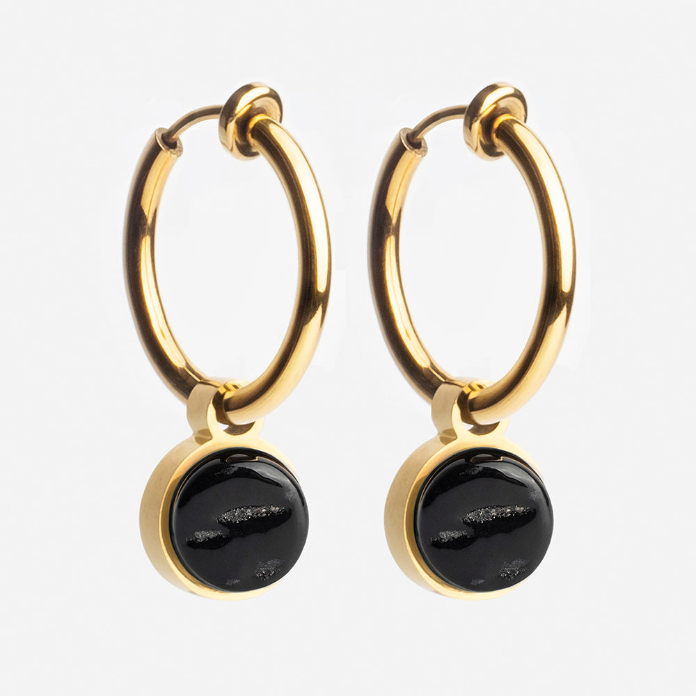 Die Clip Creolen aus hochwertigem Edelstahl sind in drei Metallfarben und 20 Steinfarben erhältlich. Die abnehmbaren Anhänger gleiten geschmeidig über die Clips und verleihen jedem Look eine individuelle Note. Der weiche Federverschluss sorgt für einen bequemen Sitz.