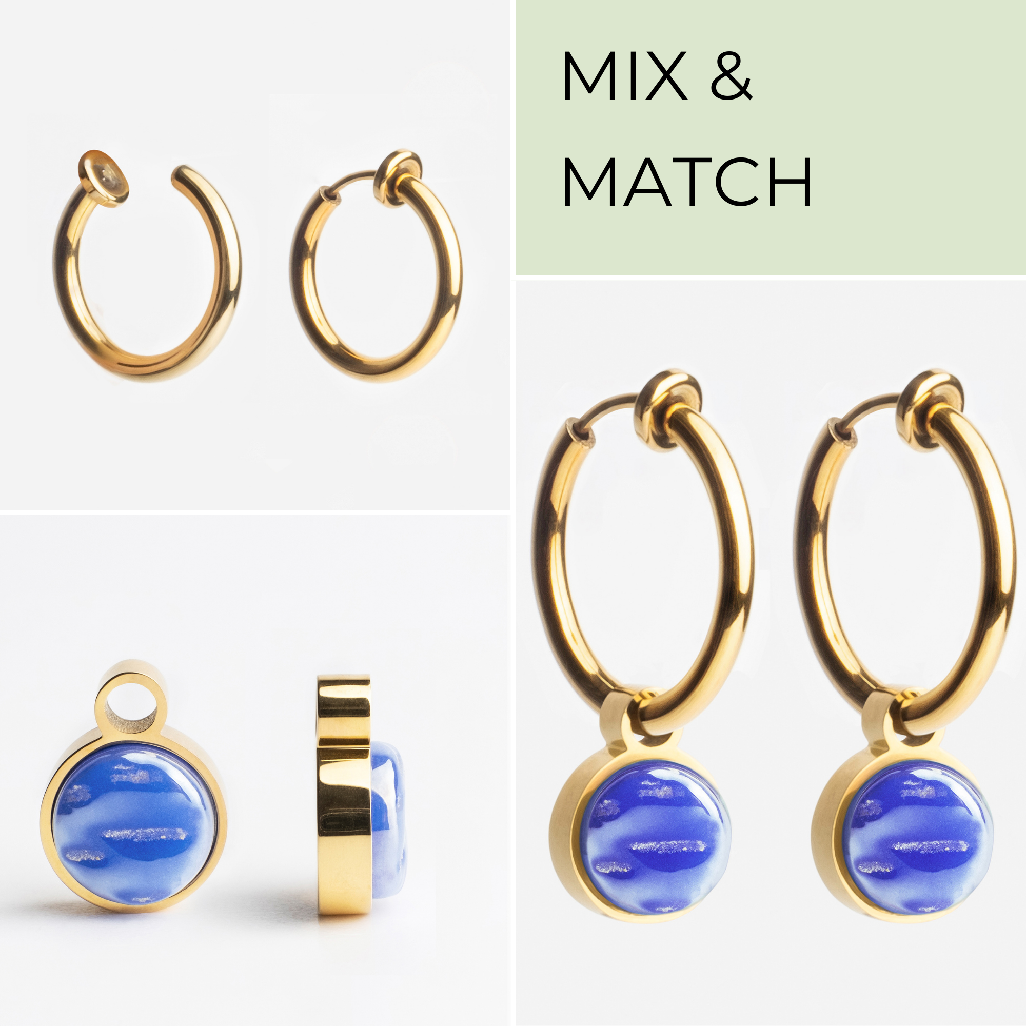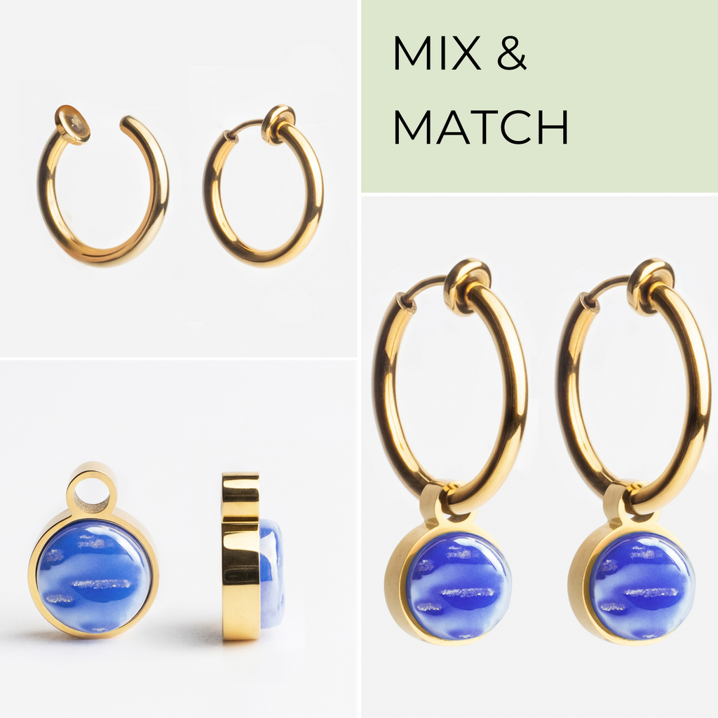 Ohrclip Creolen aus Edelstahl mit Charms zum Wechseln in 20 Farben. Perfekt für stilvolle Akzente am Ohr, auch ohne Ohrlöcher. Nachhaltig und bequem.