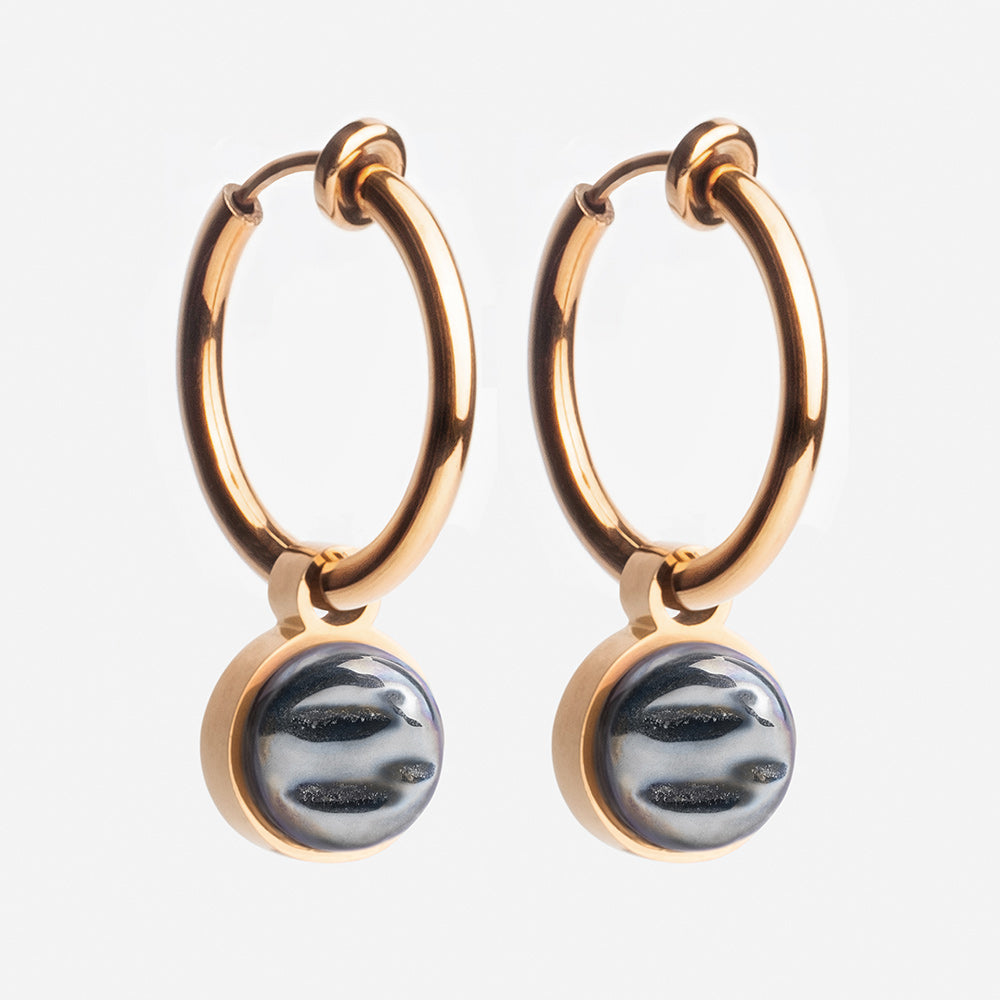 Die Clip Creolen aus hochwertigem Edelstahl sind in drei Metallfarben und 20 Steinfarben erhältlich. Die abnehmbaren Anhänger gleiten geschmeidig über die Clips und verleihen jedem Look eine individuelle Note. Der weiche Federverschluss sorgt für einen bequemen Sitz.