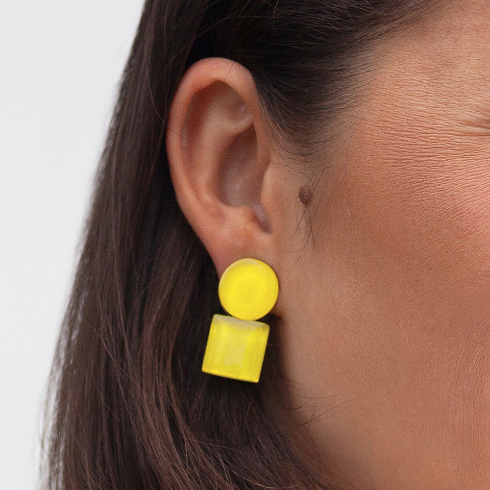 Geometrische Clip Ohrringe aus Glas – inspiriert vom Bauhaus, handgemacht aus upcycelten Fliesen.