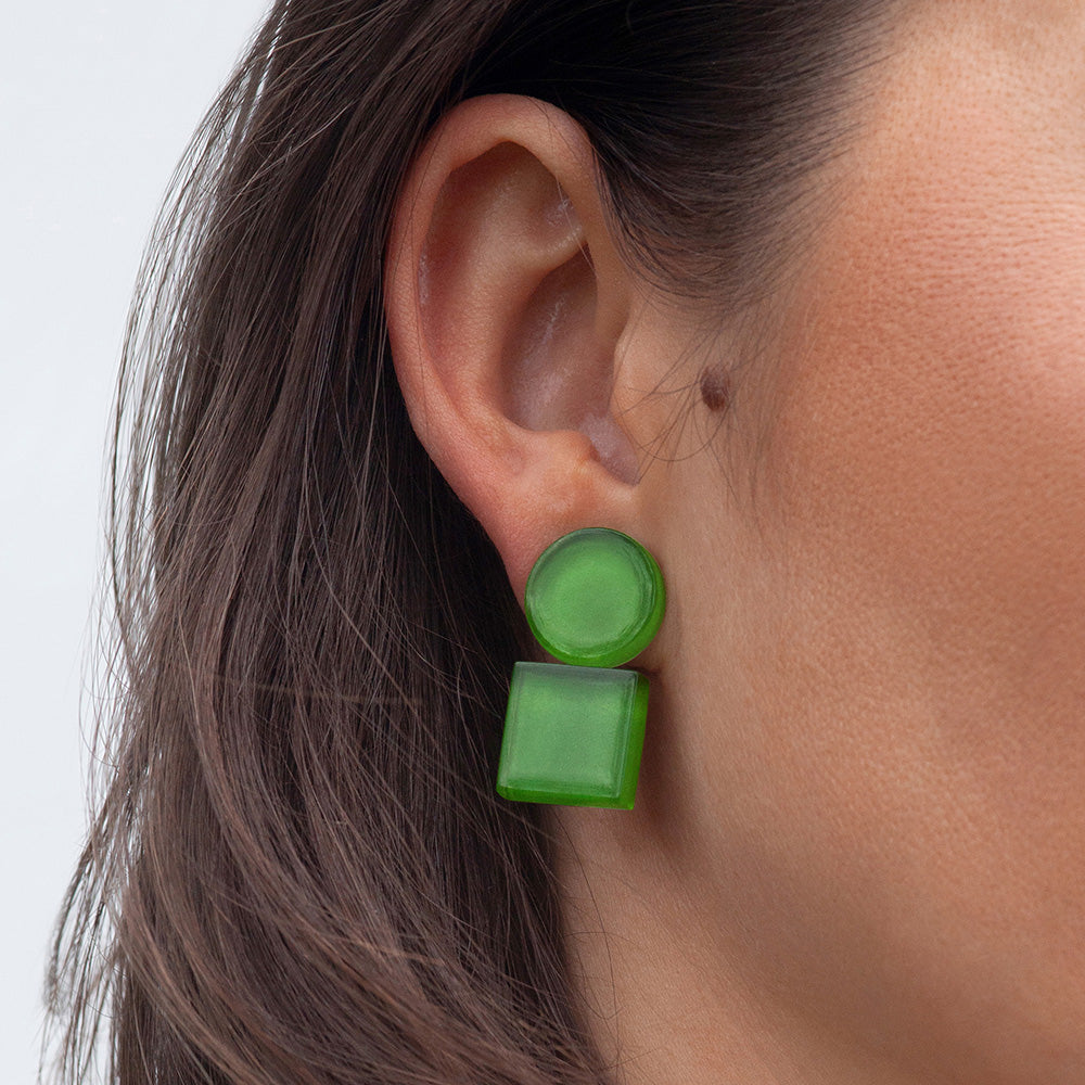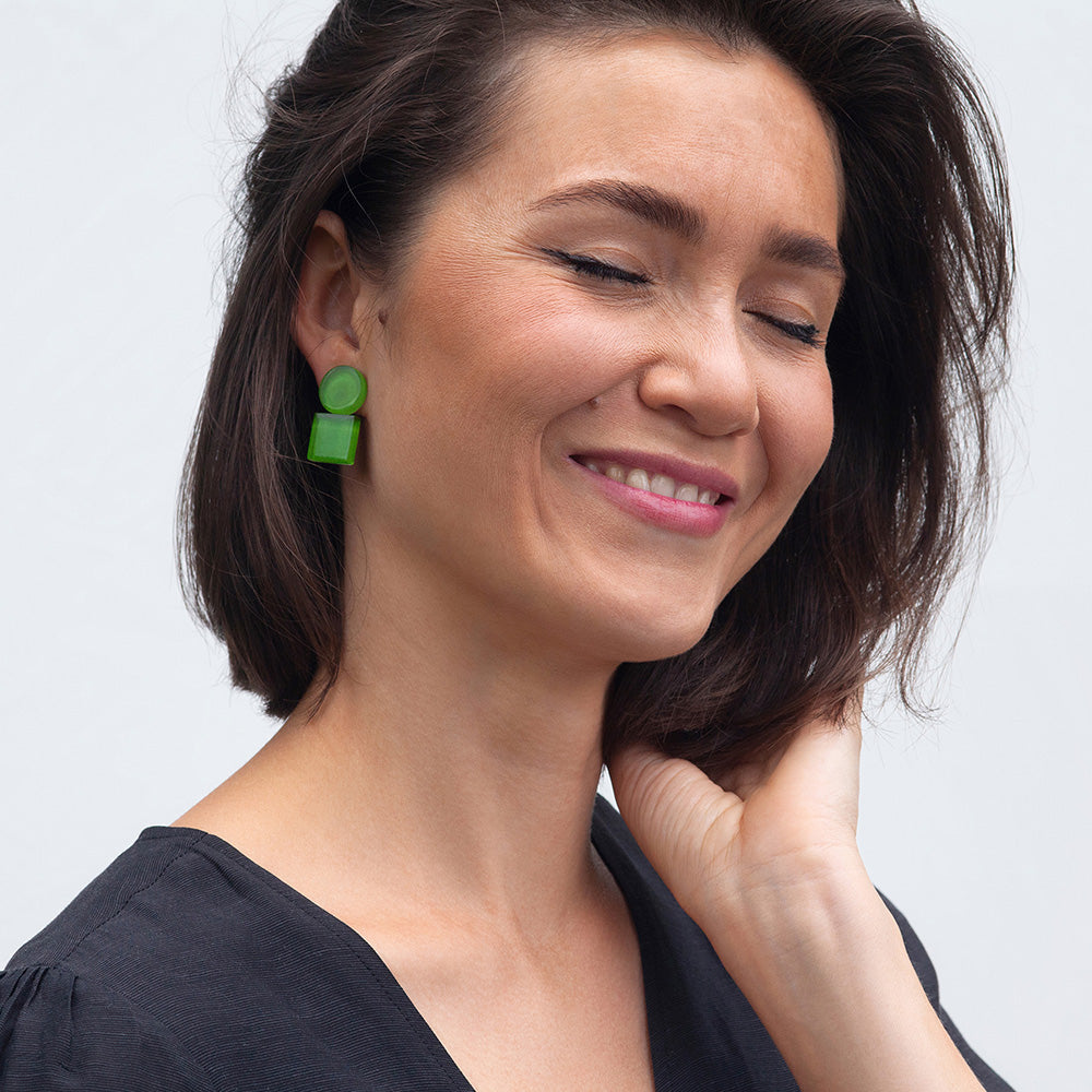 Gefertigt aus upcycelten Mosaikfliesen entsteht Ohrschmuck mit angenehmer Haptik: Die glatt geschliffene Glasoberfläche fühlt sich hochwertig an und bricht das Licht so, dass die Farbe im unteren Teil des Steins intensiv leuchtet. Ein faszinierendes Spiel aus Transparenz und Tiefe – für alle, die ein starkes Design-Statement lieben.