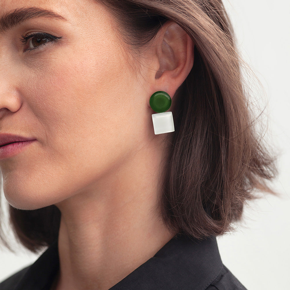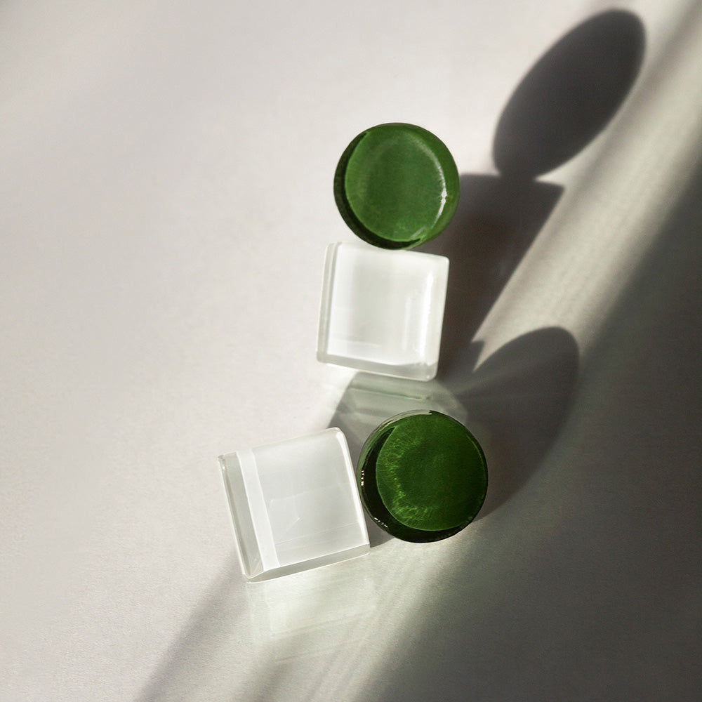 Gefertigt aus upcycelten Mosaikfliesen entsteht Ohrschmuck mit angenehmer Haptik: Die glatt geschliffene Glasoberfläche fühlt sich hochwertig an und bricht das Licht so, dass die Farbe im unteren Teil des Steins intensiv leuchtet. Ein faszinierendes Spiel aus Transparenz und Tiefe – für alle, die ein starkes Design-Statement lieben.