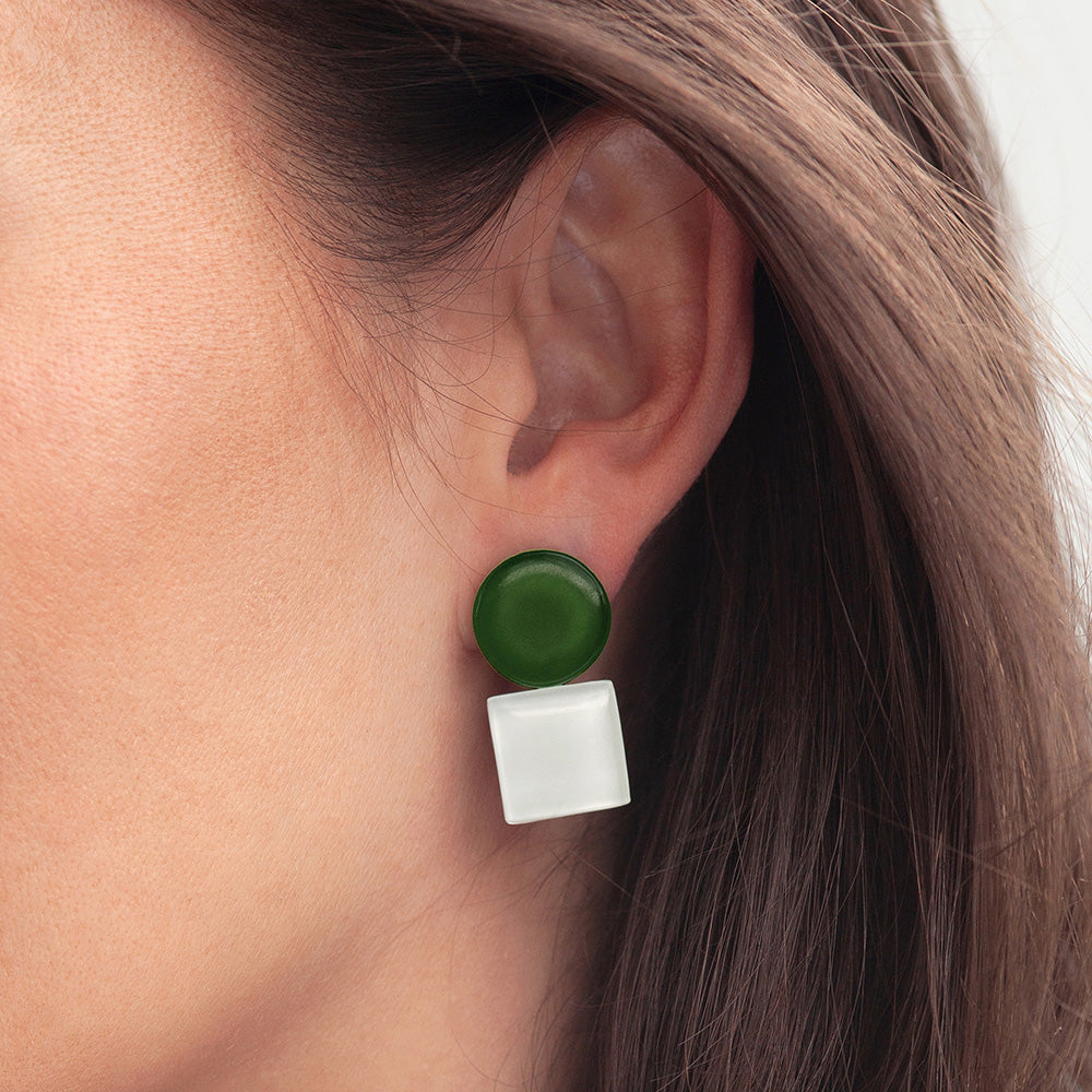 Geometrische Clip Ohrringe aus Glas – inspiriert vom Bauhaus, handgemacht aus upcycelten Fliesen.