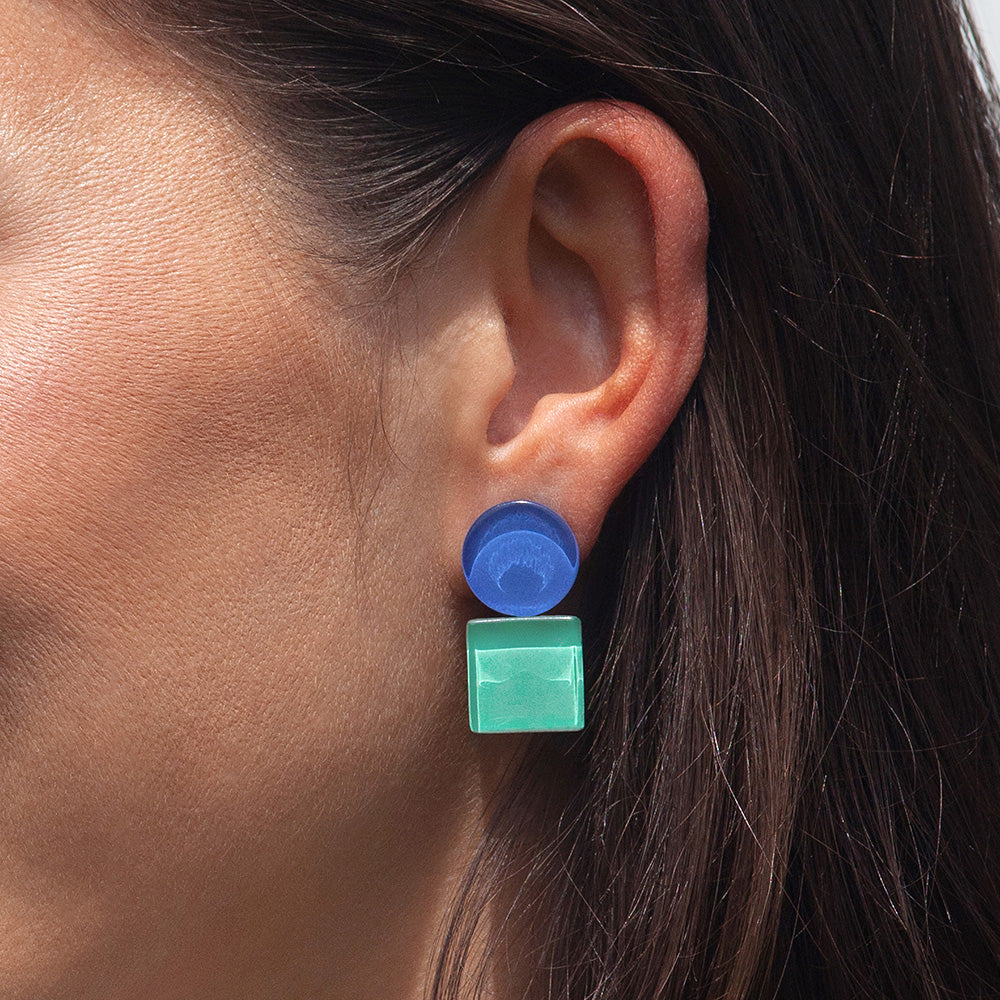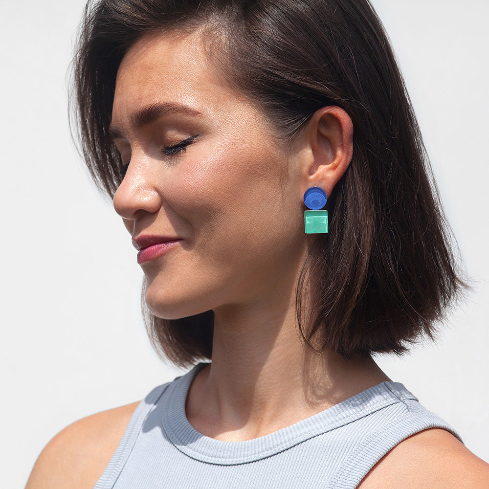 Gefertigt aus upcycelten Mosaikfliesen entsteht Ohrschmuck mit angenehmer Haptik: Die glatt geschliffene Glasoberfläche fühlt sich hochwertig an und bricht das Licht so, dass die Farbe im unteren Teil des Steins intensiv leuchtet. Ein faszinierendes Spiel aus Transparenz und Tiefe – für alle, die ein starkes Design-Statement lieben.