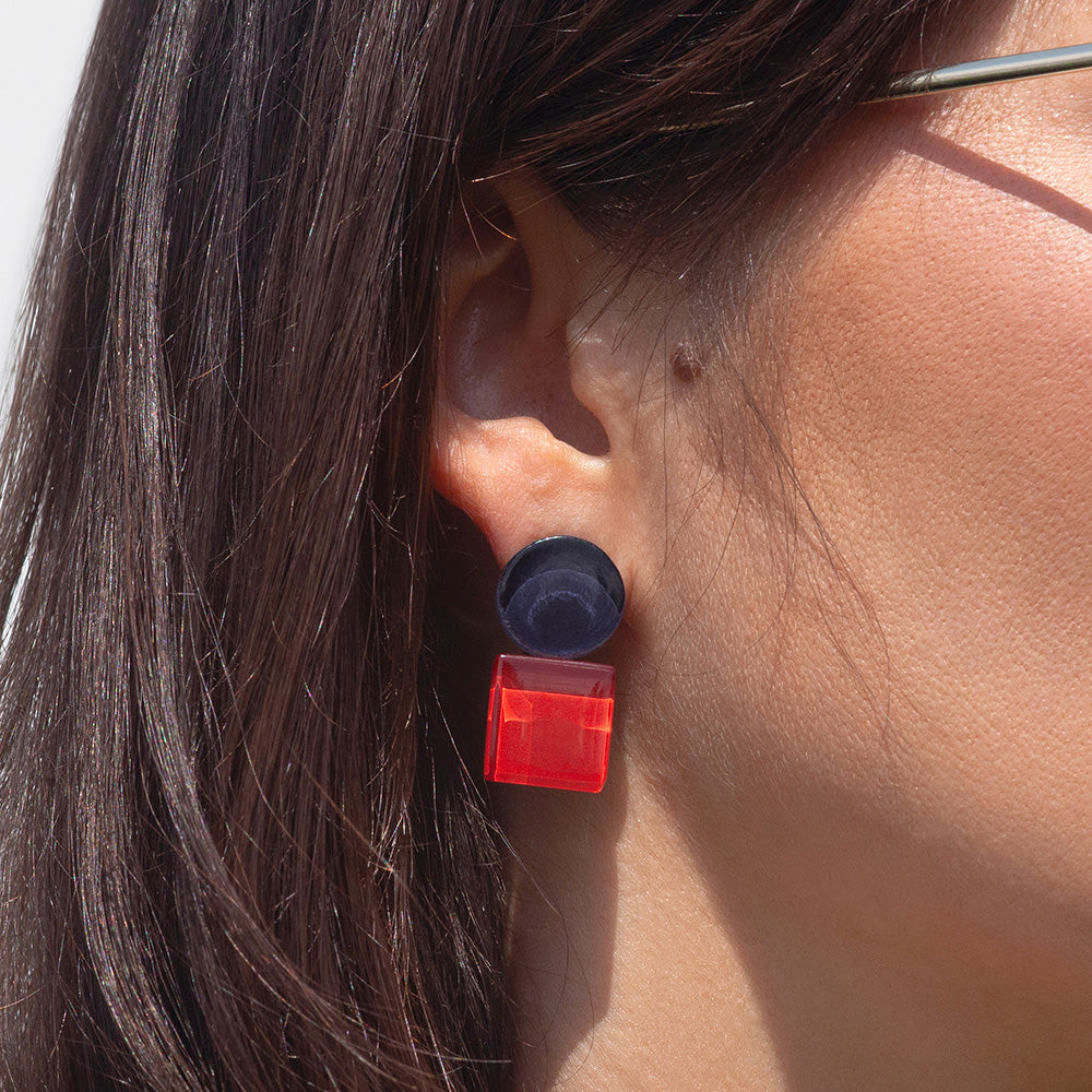 Geometrische Clip Ohrringe aus Glas – inspiriert vom Bauhaus, handgemacht aus upcycelten Fliesen.