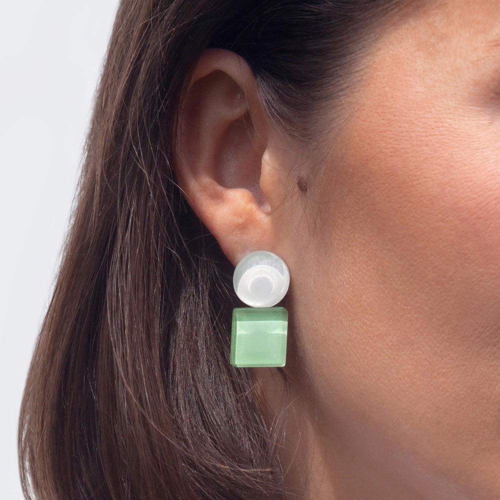 Gefertigt aus upcycelten Mosaikfliesen entsteht Ohrschmuck mit angenehmer Haptik: Die glatt geschliffene Glasoberfläche fühlt sich hochwertig an und bricht das Licht so, dass die Farbe im unteren Teil des Steins intensiv leuchtet. Ein faszinierendes Spiel aus Transparenz und Tiefe – für alle, die ein starkes Design-Statement lieben.