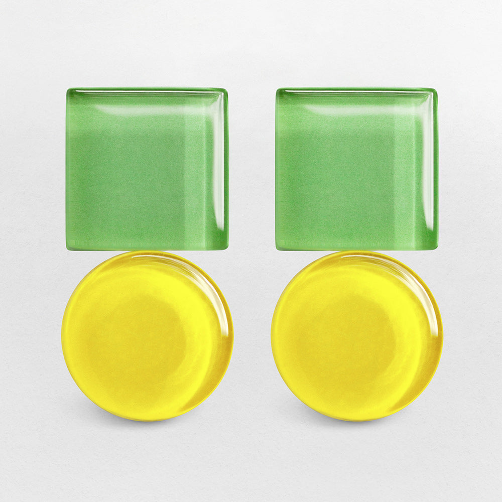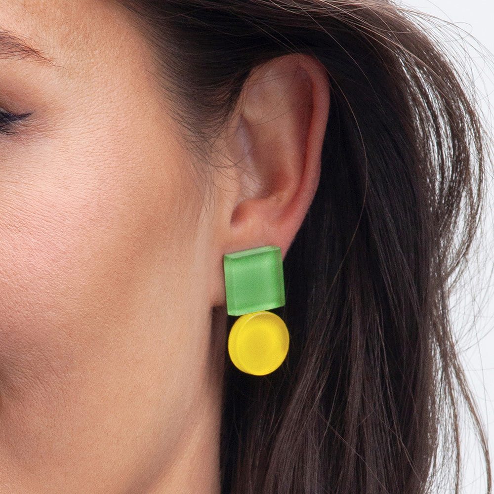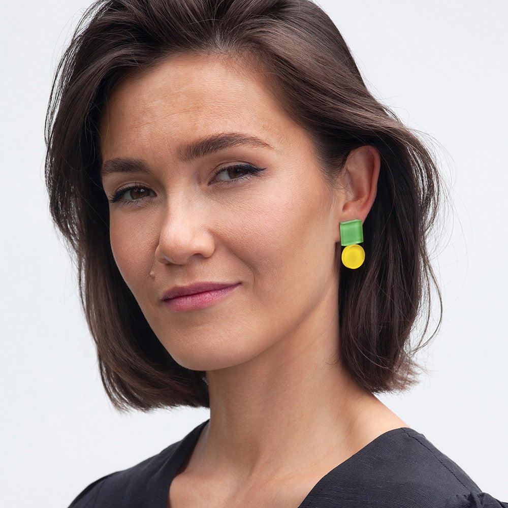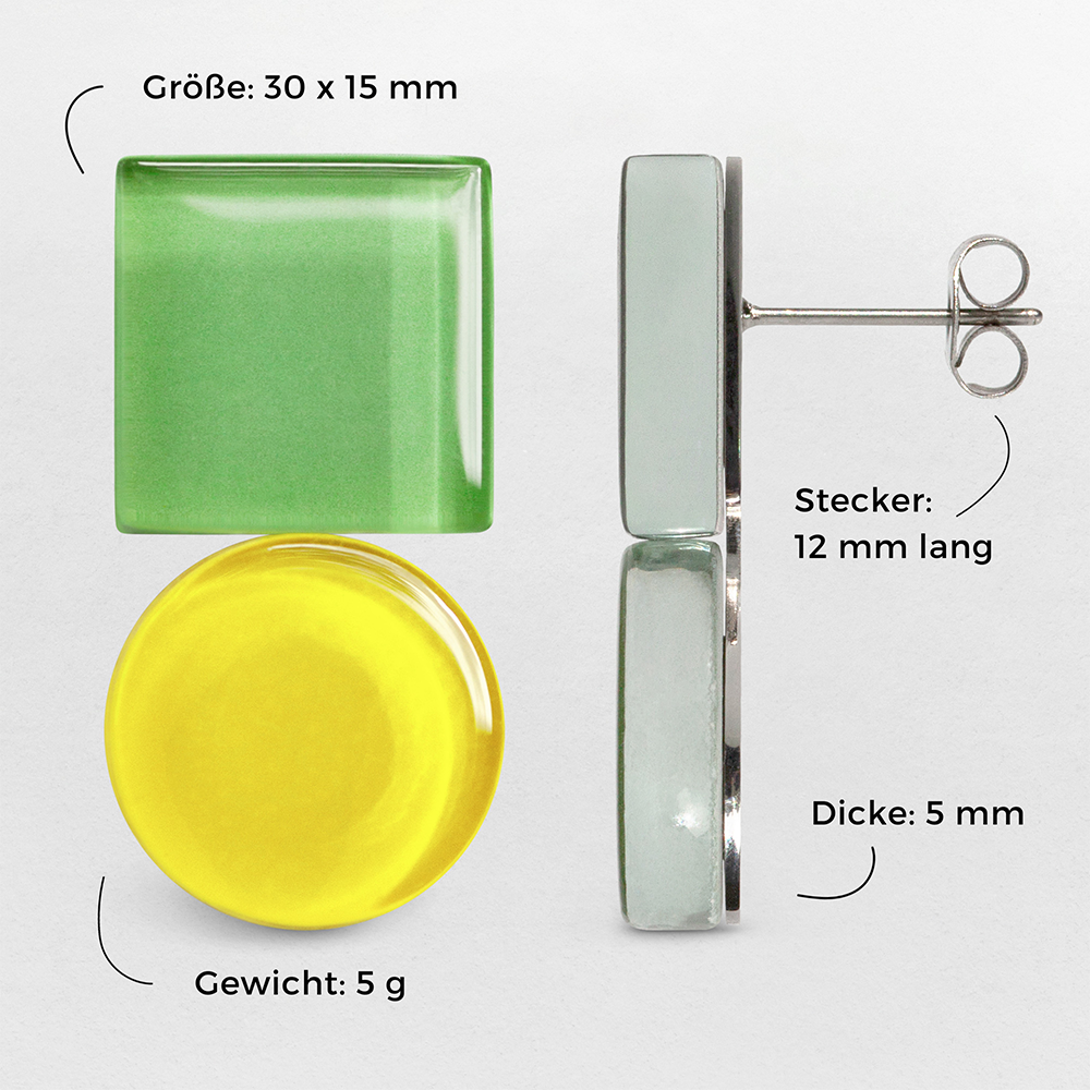 Unsere geometrischen Statement Ohrringe aus Glas vereinen Bauhaus-Ästhetik, nachhaltigen Schmuck und farbintensive Eleganz. Zwei Glaselemente – rund und eckig – bilden eine spannungsreiche Komposition, die durch ihre klare Formgebung und Farbwirkung begeistert.