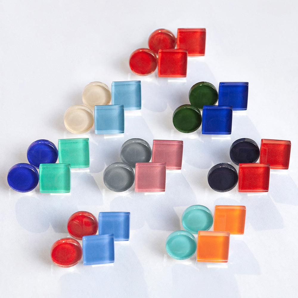 Gefertigt aus upcycelten Mosaikfliesen, besticht jedes Paar durch die angenehm glatte Haptik des Glases. Beim Lichteinfall entsteht ein faszinierendes Spiel aus Transparenz und Tiefe – die Farbe im unteren Teil der Steine beginnt regelrecht zu leuchten.