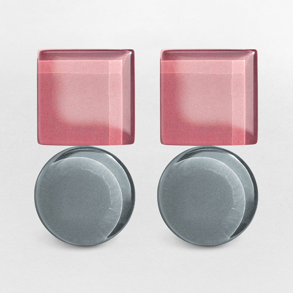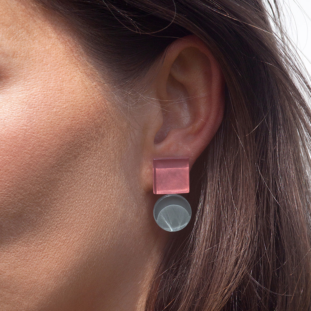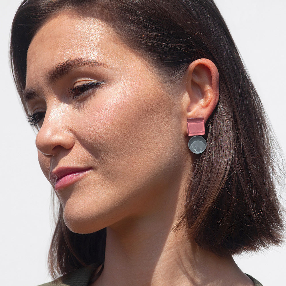 Unsere geometrischen Statement Ohrringe aus Glas vereinen Bauhaus-Ästhetik, nachhaltigen Schmuck und farbintensive Eleganz. Zwei Glaselemente – rund und eckig – bilden eine spannungsreiche Komposition, die durch ihre klare Formgebung und Farbwirkung begeistert.