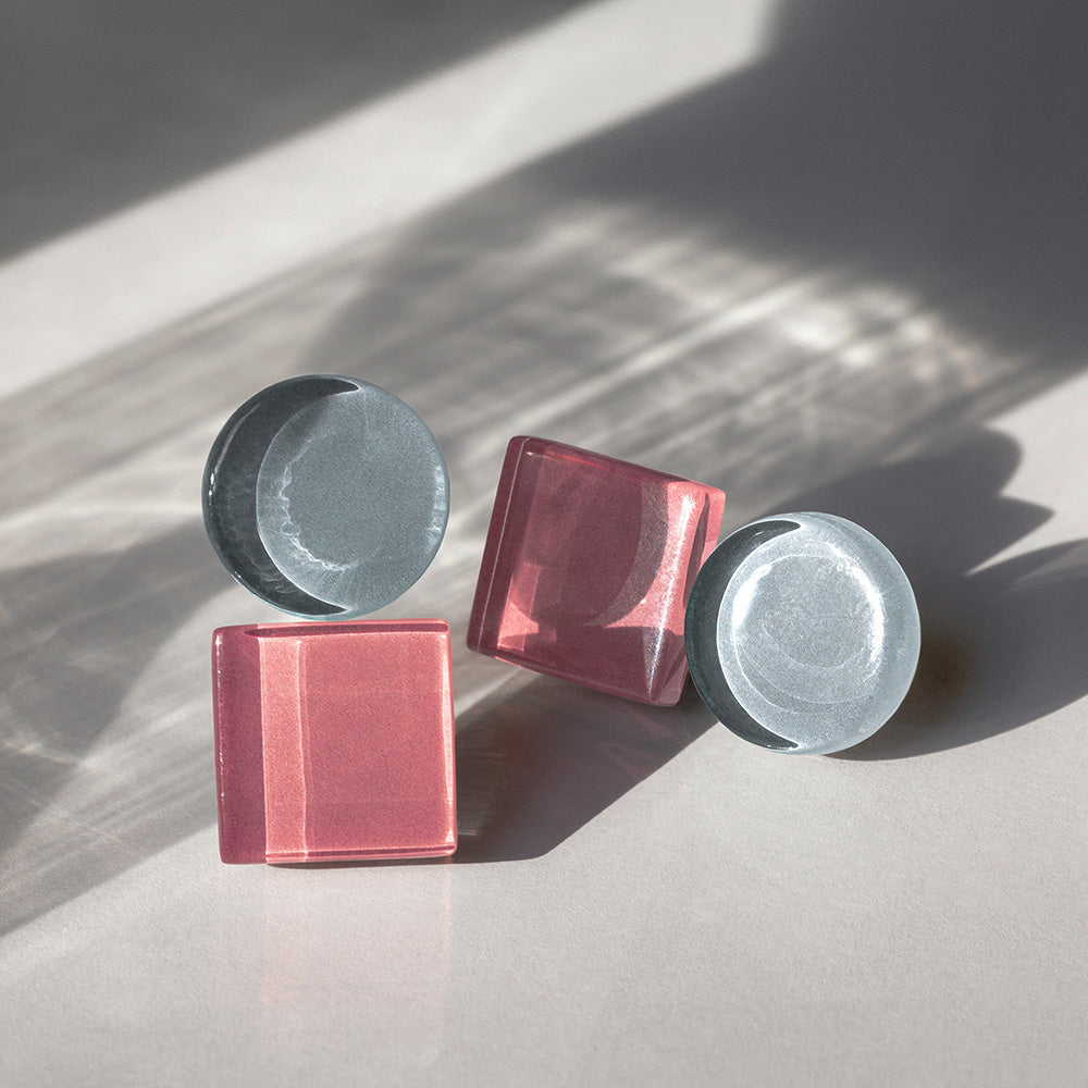 Gefertigt aus upcycelten Mosaikfliesen, besticht jedes Paar durch die angenehm glatte Haptik des Glases. Beim Lichteinfall entsteht ein faszinierendes Spiel aus Transparenz und Tiefe – die Farbe im unteren Teil der Steine beginnt regelrecht zu leuchten.
