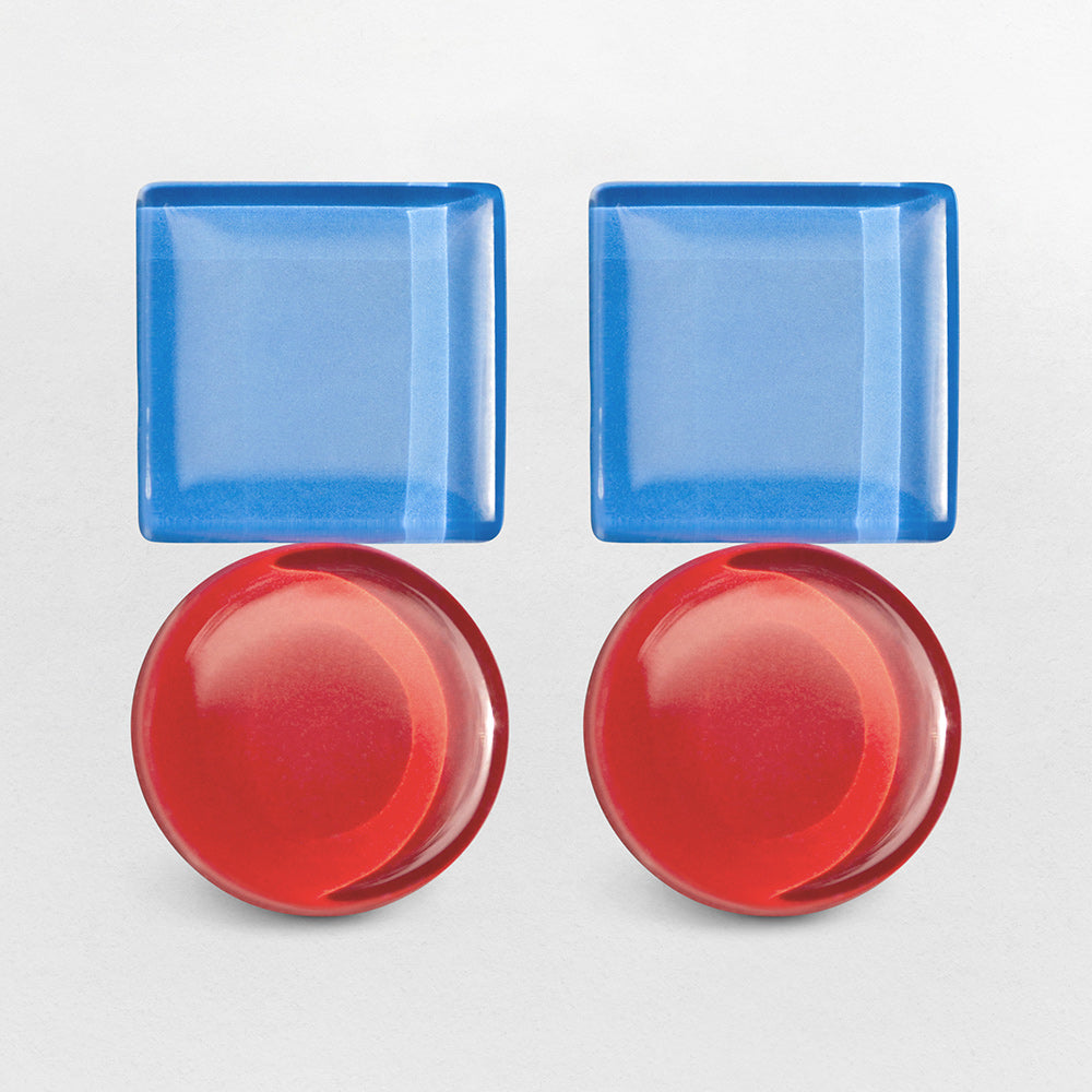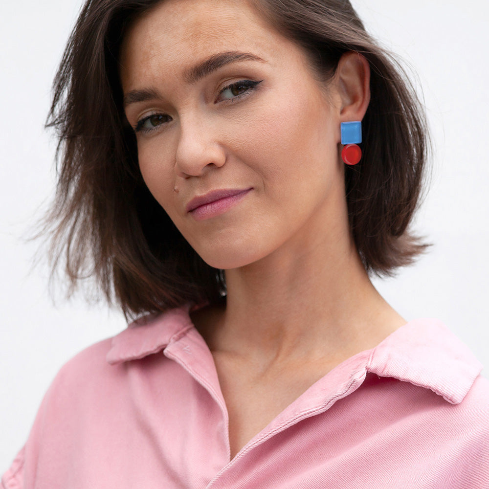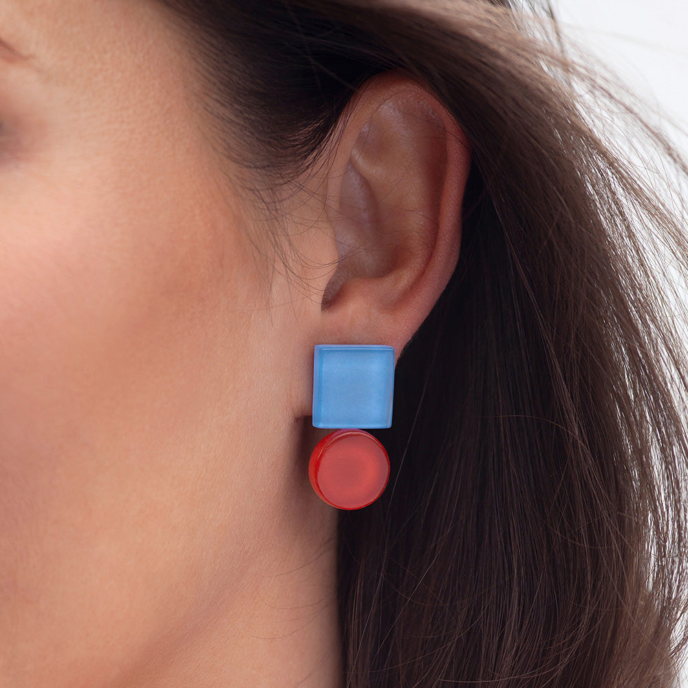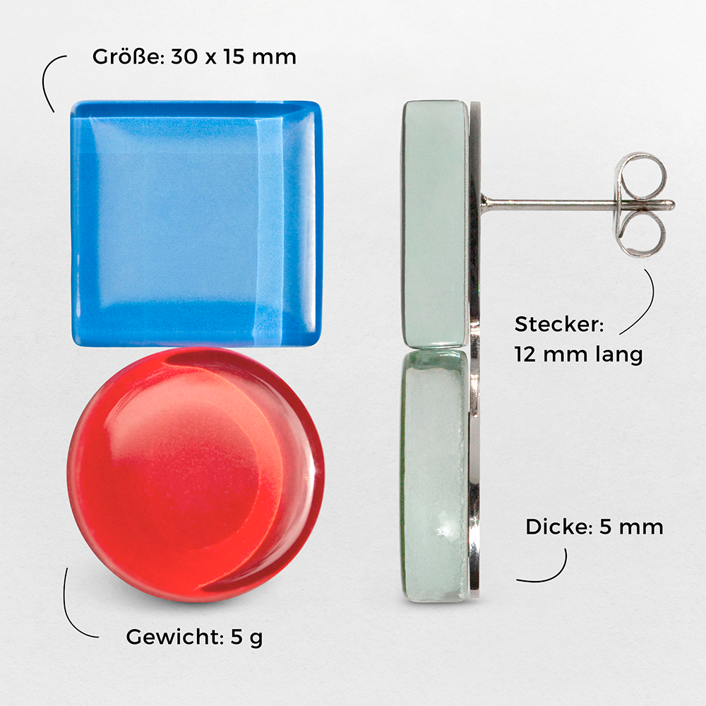 Unsere geometrischen Statement Ohrringe aus Glas vereinen Bauhaus-Ästhetik, nachhaltigen Schmuck und farbintensive Eleganz. Zwei Glaselemente – rund und eckig – bilden eine spannungsreiche Komposition, die durch ihre klare Formgebung und Farbwirkung begeistert.