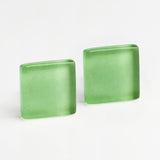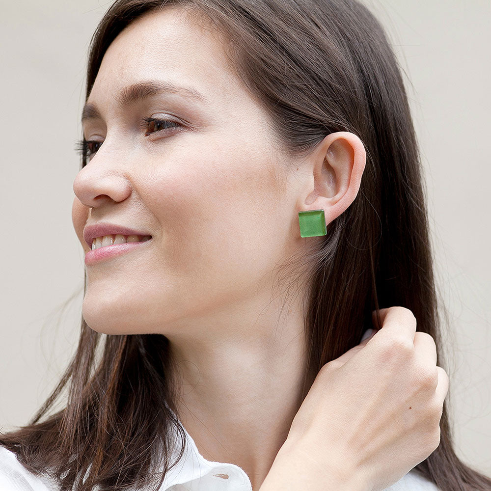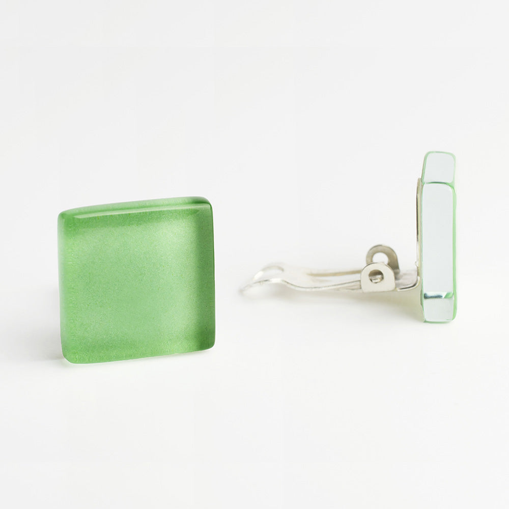 Quadratische Ohrclips aus Glas. Auch ohne Ohrlöcher tragbar! Die Ohrclips haben ein zeitloses Design und sind in verschiedenen Farben erhältlich.